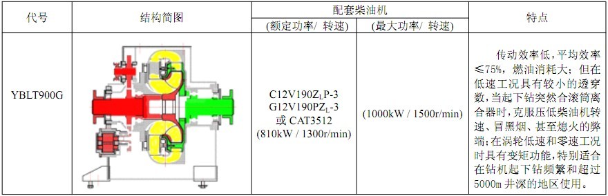 1985年研制成功的YBLT900型離心變矩器,取代從國(guó)外進(jìn)口的原CHC750型變矩器。而 YBLT900型變矩器為單級(jí)渦輪變矩器,在循環(huán)圓內(nèi)布置泵輪、渦輪和導(dǎo)輪各一個(gè)。采用間隙密封,軸承齒輪的潤(rùn)滑與變矩器的工作油均為同一種油。與原CHC750變矩器相比,具有較高的效率、使用可靠、壽命長(zhǎng)和維護(hù)方便等優(yōu)點(diǎn),近十多年來(lái),與12V190和CAT3512等型柴油機(jī)匹配,應(yīng)用在國(guó)產(chǎn)ZJ40~70L型鉆機(jī)上,作為柴油機(jī)與并車鏈條箱之間的傳動(dòng)裝置,得到了廣泛的應(yīng)用。2009年我公司對(duì)該型號(hào)變矩器進(jìn)行了改進(jìn),形成了YBLT900G改進(jìn)型離心變矩器,其結(jié)構(gòu)特點(diǎn)是:①.采用沿軸心線水平分箱的鋼板焊接箱體,取代原變矩器分為左、中、右垂直分箱的鑄造箱體,克服了原變矩器垂直分箱面及鑄造缺陷造成的易漏油缺點(diǎn),同時(shí)使得變矩器的裝拆更加容易,方便了現(xiàn)場(chǎng)的維護(hù);②.供油泵及其進(jìn)入油冷卻的管線均布置在箱體內(nèi),取消了橡膠軟管線,提高了油管路使用的可靠性;③.焊接箱體改善了外觀質(zhì)量;④.改進(jìn)型與原型變矩器的安裝尺寸完全相同,兩者可以進(jìn)行互換。